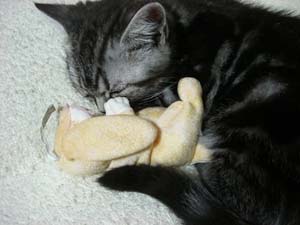 その前まで遊んでいたうさぎさんを抱え込むようにして寝ていました。